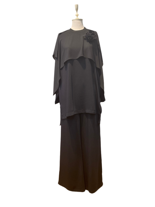 1058 Tül ve Gül Aksesuar Detaylı Pantolonlu Takım Siyah