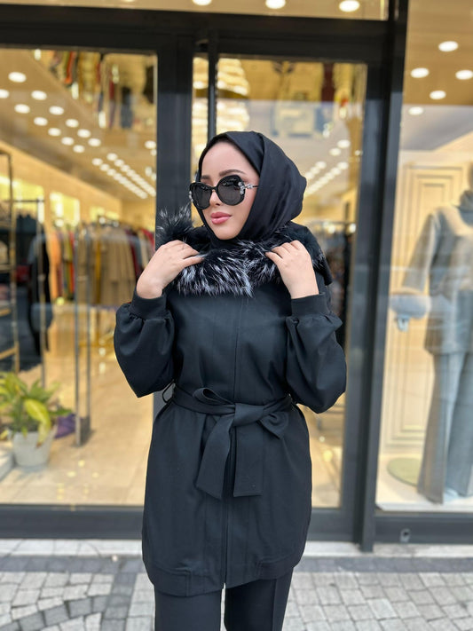 72011 Orijinal Tilki Kürk Detaylı Kapüşonlu Pantolon Takım Siyah