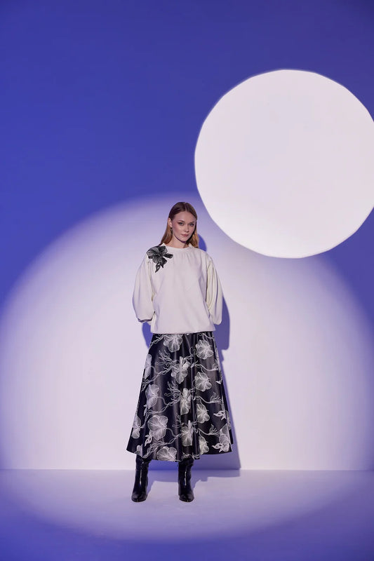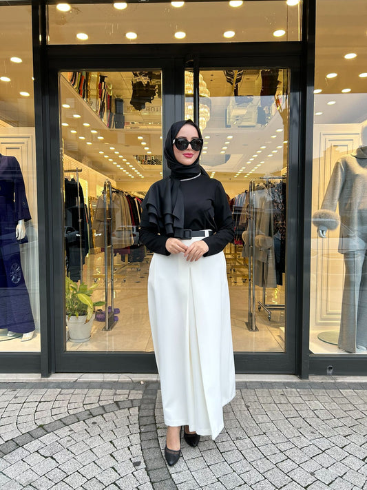 9017 Organze Plikaşeli Etek Takım Ekru - Siyah