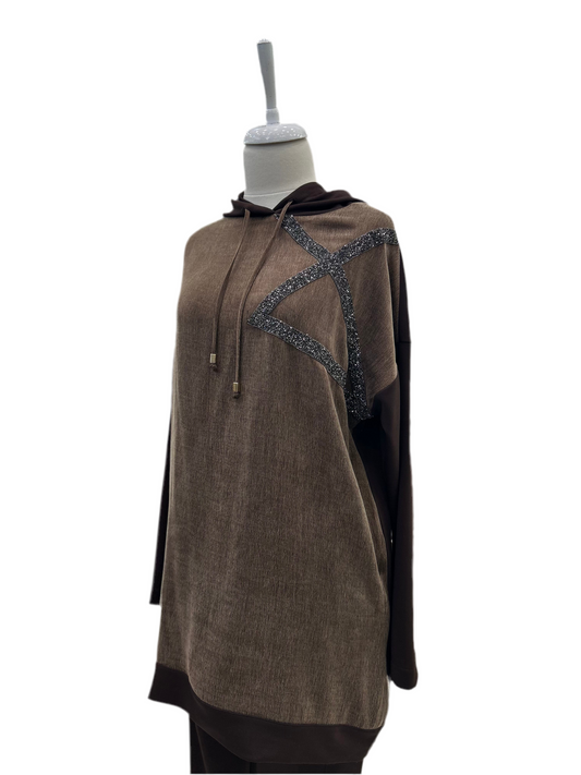 72068 Kapüşonlu Taşlanmış İpek Kumaş Birleşimli Pantolon Takım