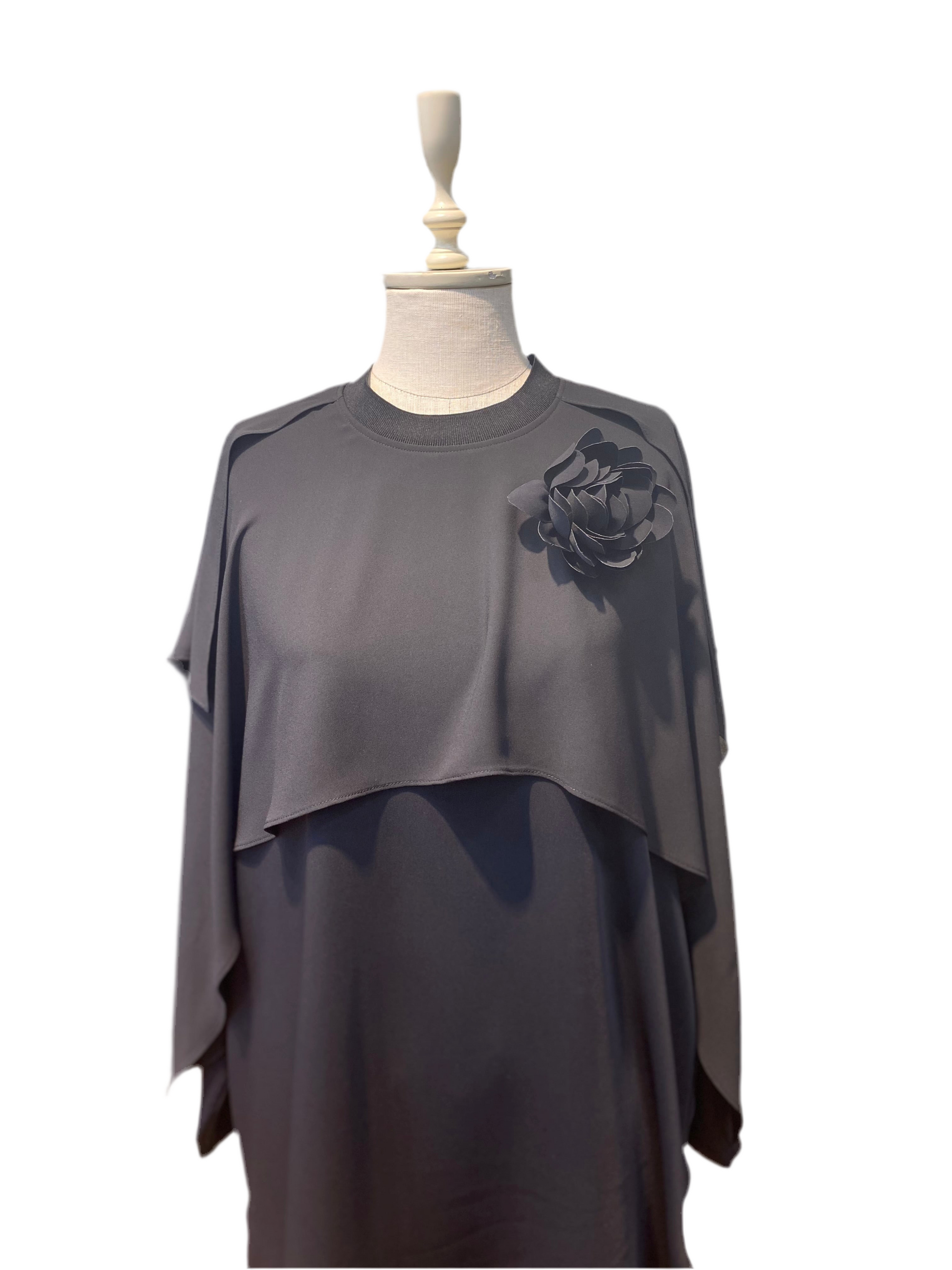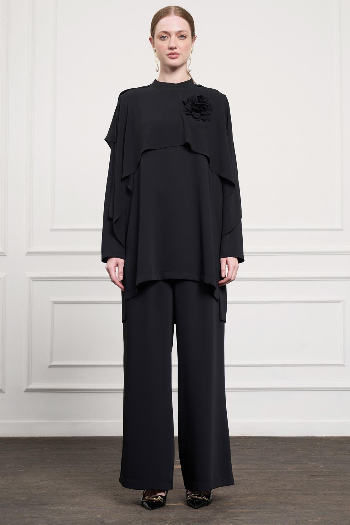 1058 Tül ve Gül Aksesuar Detaylı Pantolonlu Takım Siyah