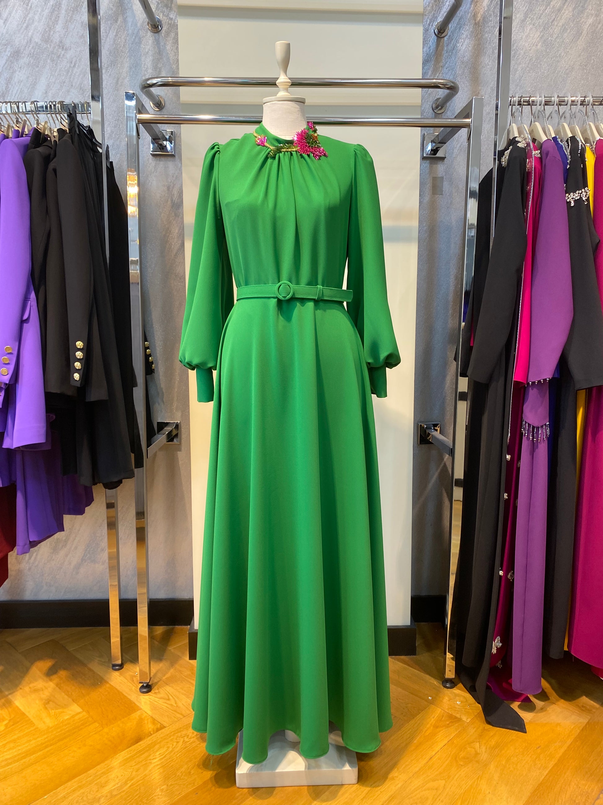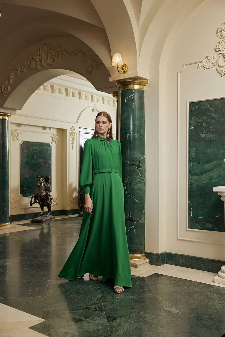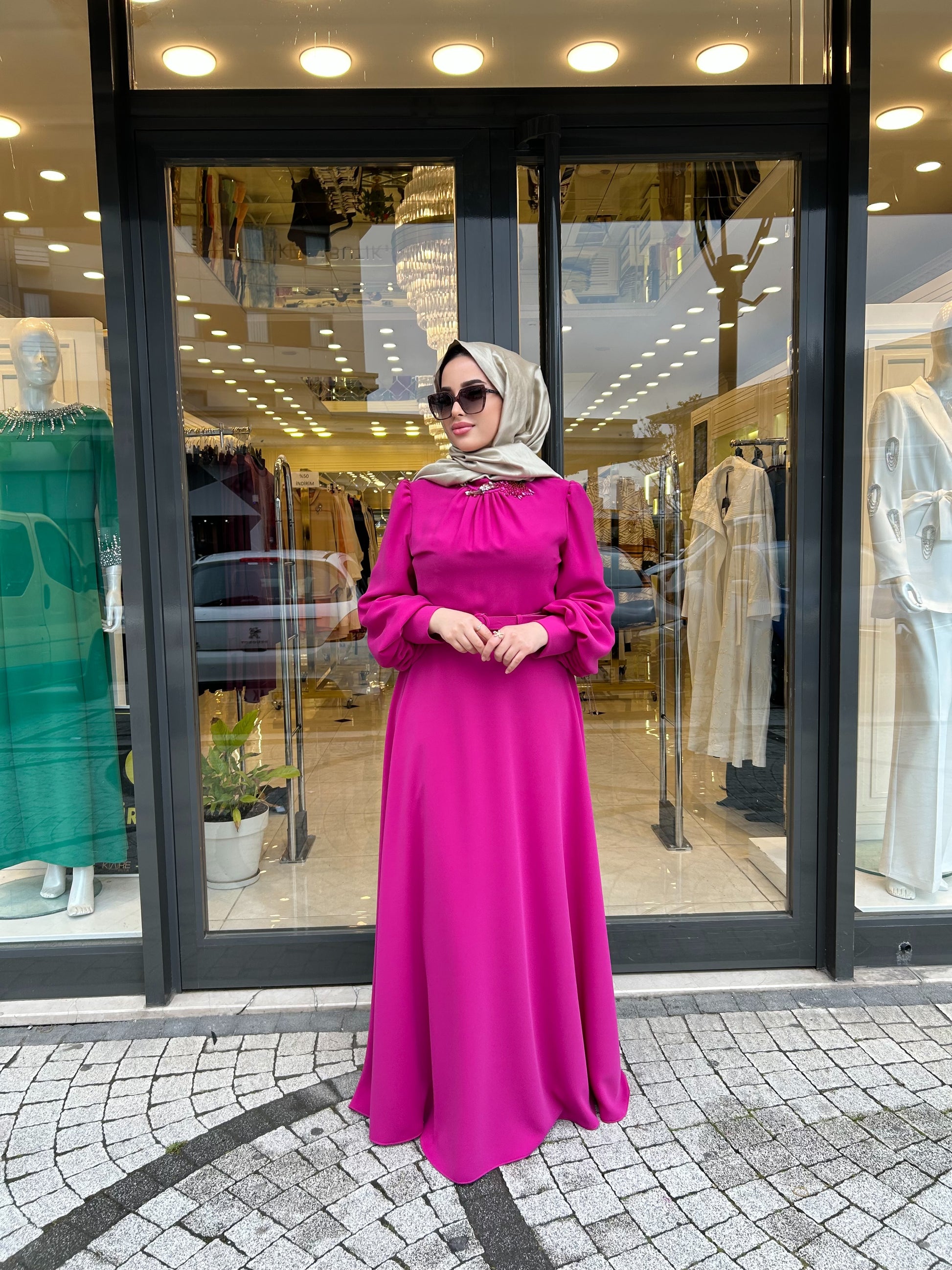 Krep kumaştan oluşan tesettür abiye elbisesi
