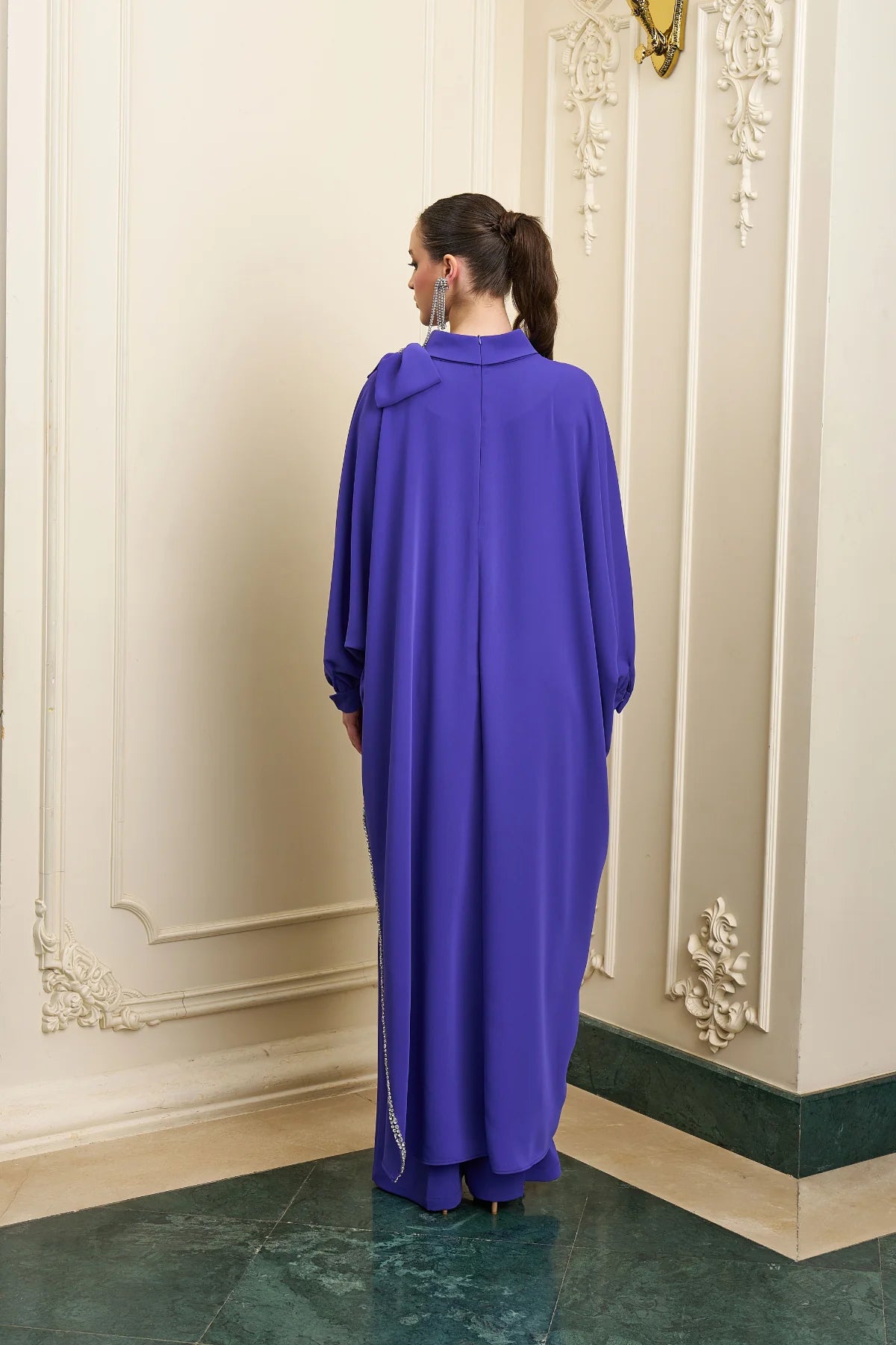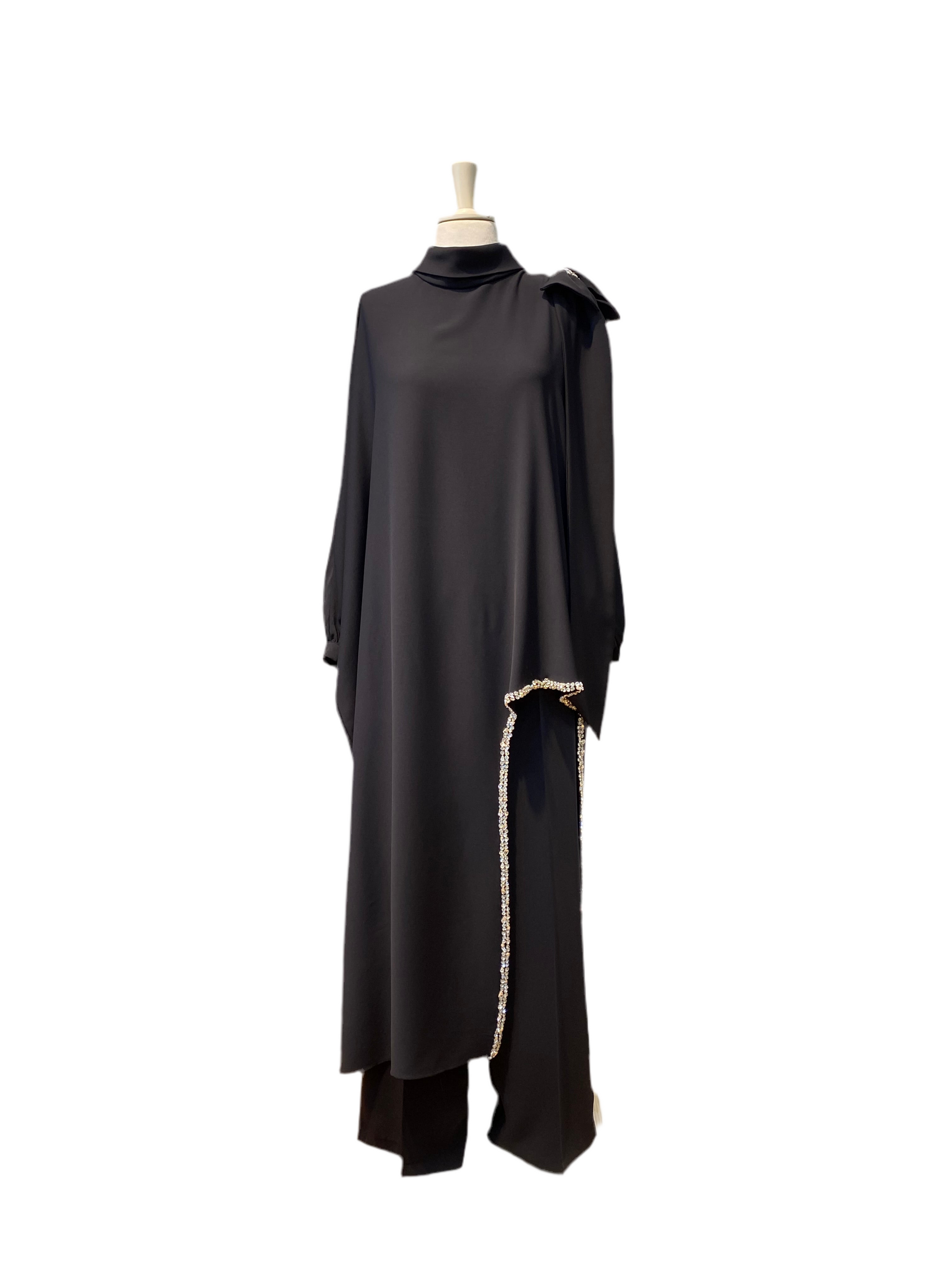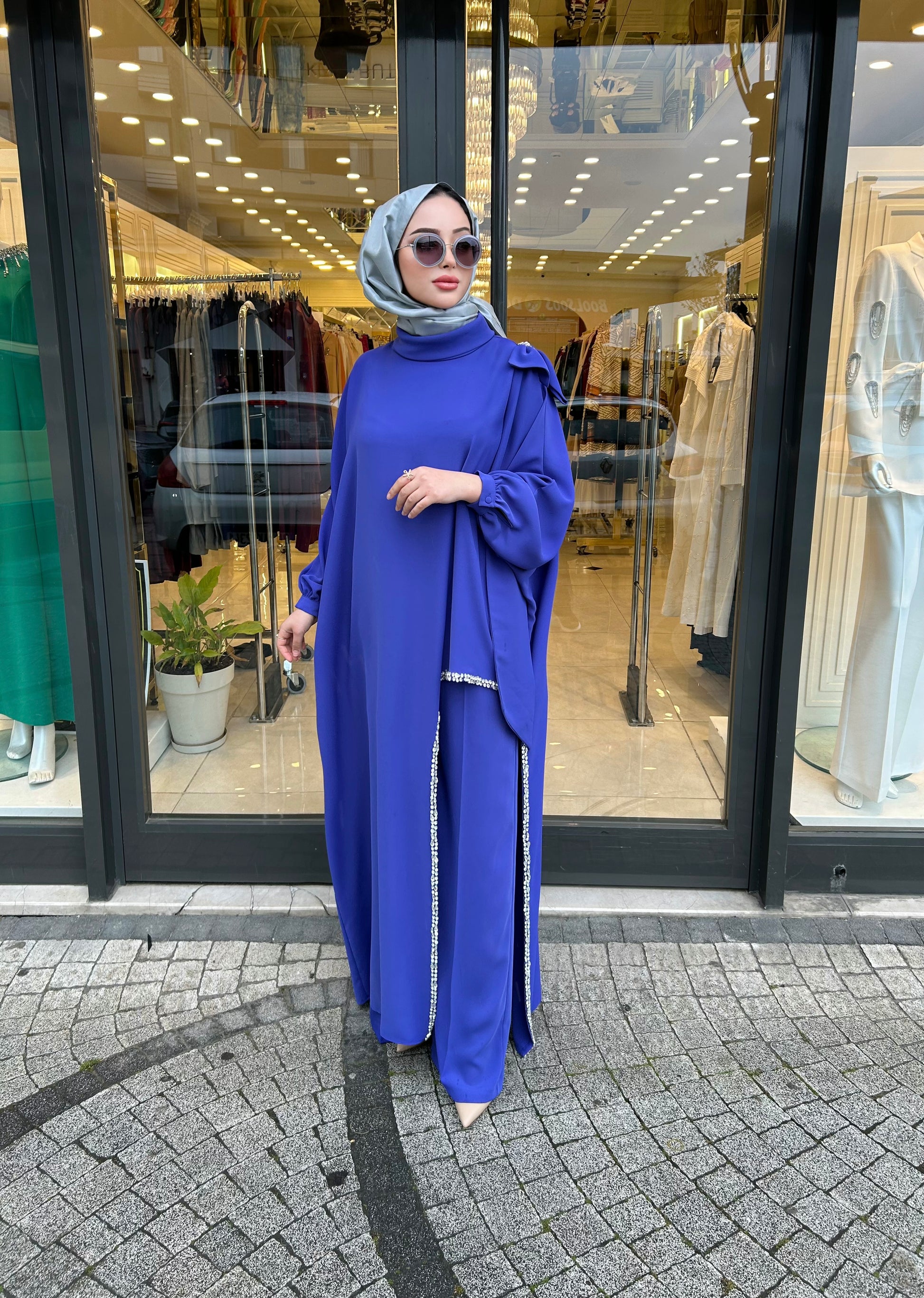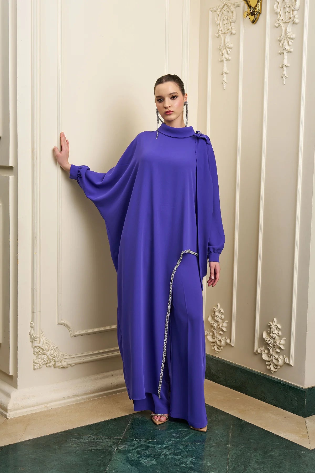 Fiyonk ve Taş detaylı tunik ve geniş paça pantolon olmak üzere şahane bir kombin