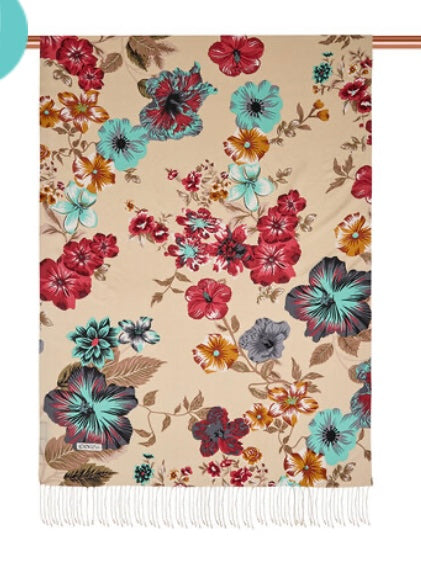 Krem Petunya Desenli ipek şal