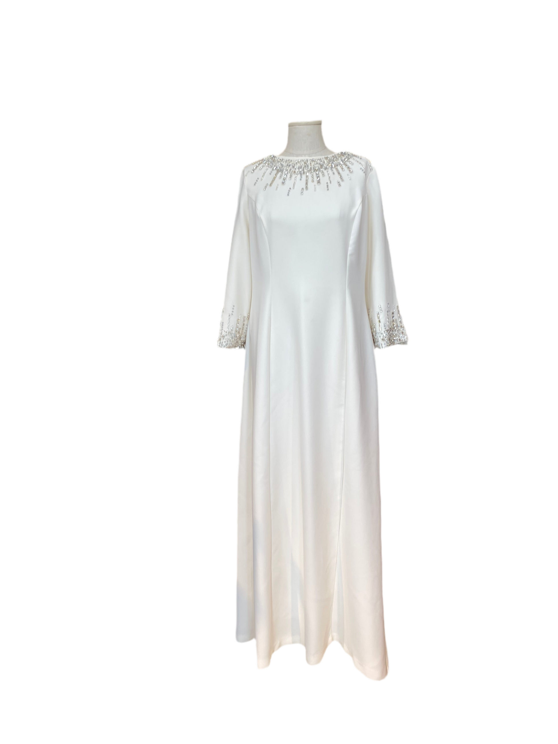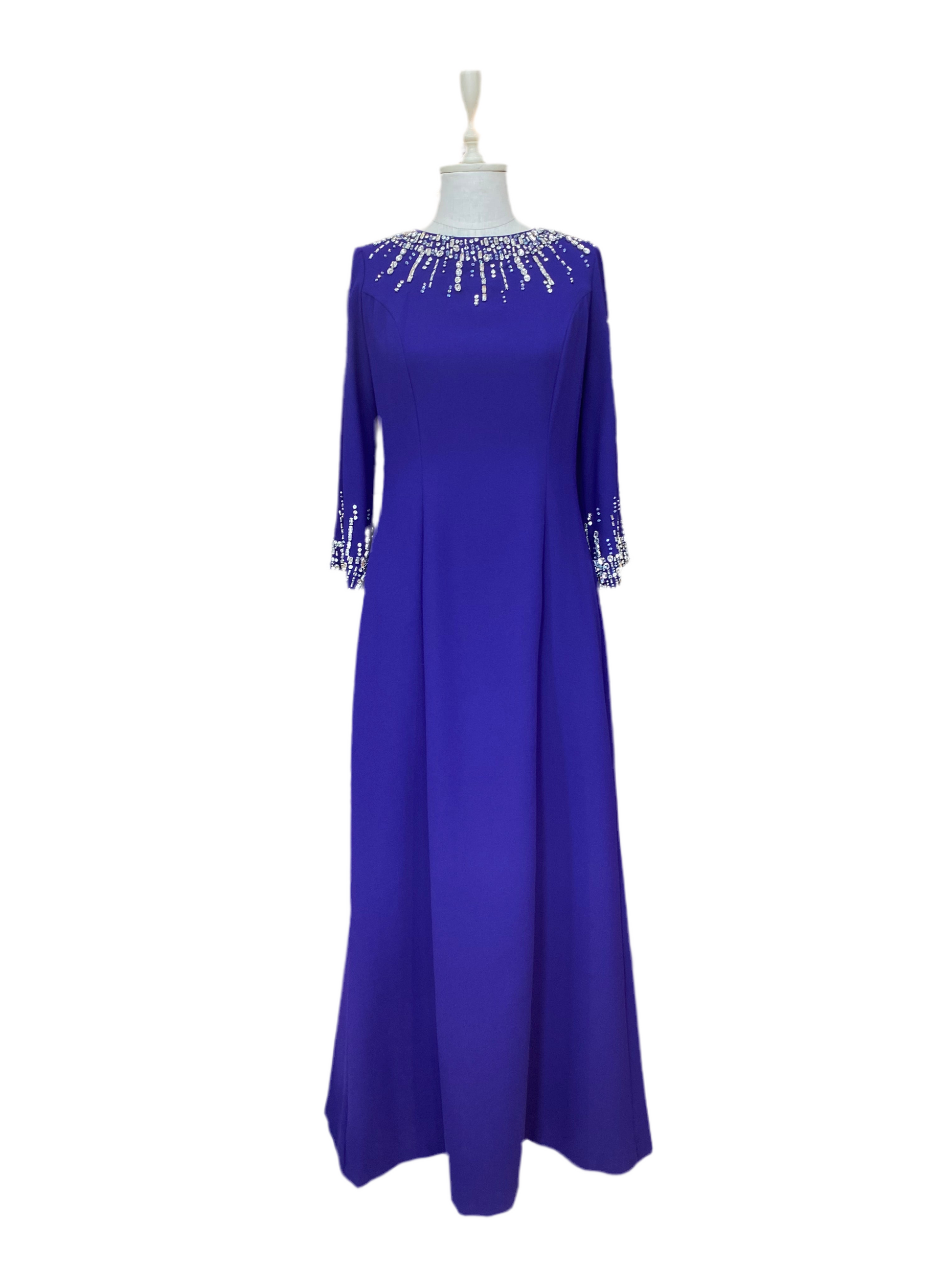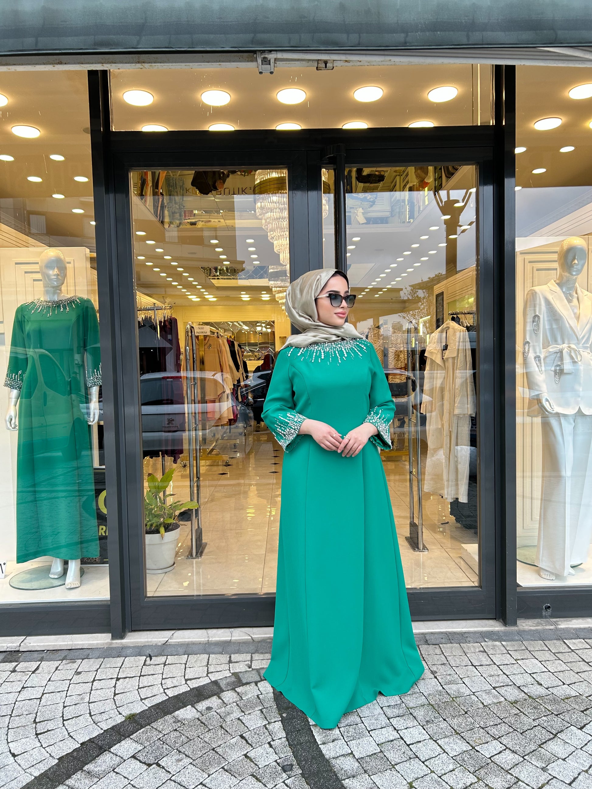 Jamila Sarah Boynu ve Bilek Detayı Taşlı Zümrüt Yeşili Elbise